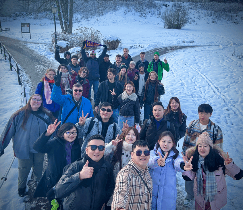 1月9日,访学交流团启程赴德,于次日抵达法兰克福,与美国阿尔弗莱德大学学生汇合,共同组成国际联合研学团队。在德期间,团队先后参访斯图加特城市广场、保时捷博物馆,深入了解德国工业制造与工匠精神;走访海登海姆商业中心,实地感受当地商业文化;登临海伦斯坦城堡,俯瞰城市全景;赴罗腾堡考察历史遗产,领会其文化保护与城市发展脉络。行程中,同学们还通过共同研讨、餐饮交流等方式,与美国学生及当地民众展开多维度互动。其中,中国学生带来的特色零食“辣条”成为文化交流的生动媒介,增添了轻松友好的交流氛围。参与学生表示:“此次访学不仅拓宽了我们的国际视野,也让我们在真实的跨文化环境中锻炼了沟通与合作能力。”德国合作方教师约根教授在指导行程时也充分肯定了中外学生积极互动的学习态度。