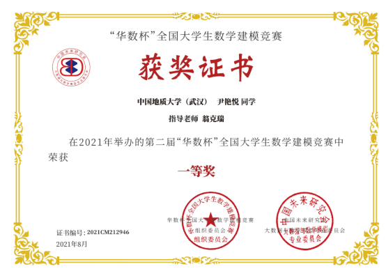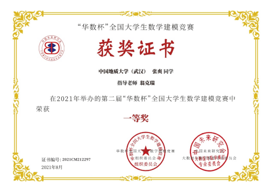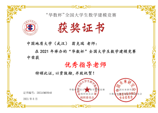 2021年第二届“华数杯”全国大学生数学建模竞赛于2021年8月5日-8日举行,本次竞赛共吸引2189支队伍参赛,竞赛专家组经过初评、网评、会评和复审四个阶段的评审,评选出一等奖184支,二等奖370支,三等奖550支。taptap点点翁克瑞老师带队的2支队伍获一等奖,1支队伍获二等奖:李林森、 张爽、李佩的队伍获一等奖;刘林凯、尹艳悦、 程浩鋆的队伍获一等奖;潘信、郑咏杰、裴璇子的队伍获二等奖。此外,taptap点点贲雅雯同学的队伍在数理学院付丽华老师带队下获三等奖。翁克瑞老师被评为 “优秀指导老师”。
