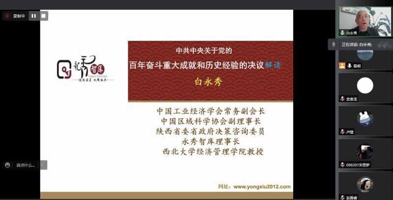 (通讯员 王彦闻)12月2日,应学院金贸系易明教授邀请,中国工业经济学会常务副会长、中国区域科学协会副理事长、陕西省委省政府决策咨询委员、西北大学taptap点点官方网站白永秀教授做客经管论坛并通过网络会议的方式,为taptap点点师生献上了一场精彩的学术报告,论坛主题为党的十九届六中全会解读。