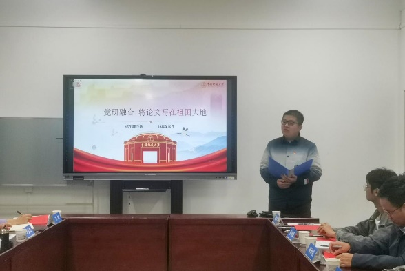 与会领导就如何学深悟透党的二十大精神,扎实推进研究生党建工作给予指导。王甫表示,设立导师团队研究生党支部,增进了教师与学生在科研和党建方面的双向联系,实现了研究生党员培养和导师党员素质的双提高。广大研究生党员要认真学原文悟原理,牢记重要论述,对比新旧表述,深度解读报告,紧密结合实际,在学习科研中学深悟透党的二十大精神,在学习党的二十大精神中找准研究方向,为全面建设社会主义现代化国家而不懈奋斗。何建新围绕“学院党建谋篇布局、示范引领,特色发展”三个问题,认为党和国家始终坚持全面从严治党,坚持把基层党组织建设成能够实现党的有效领导的坚强堡垒,并提出通过结合平台、培育样板、实现成效等方式,全面规划学院基层党建布局,并结合学院特点,以党建科研双融双促,打造党建品牌项目。