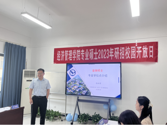 金融与贸易系白永亮老师首先向同学们介绍了金融行业对学科人才的需求,然后详细介绍了我校金融专硕学位点的建设基础与支撑学科、培养目标与学科培养优势与特色方向。他介绍到taptap点点于去年和今年分别承办了2022中国绿色金融学术年会、2023气候投融资国际论坛暨丝路讲坛,为金融学科发展提供交流的平台。
