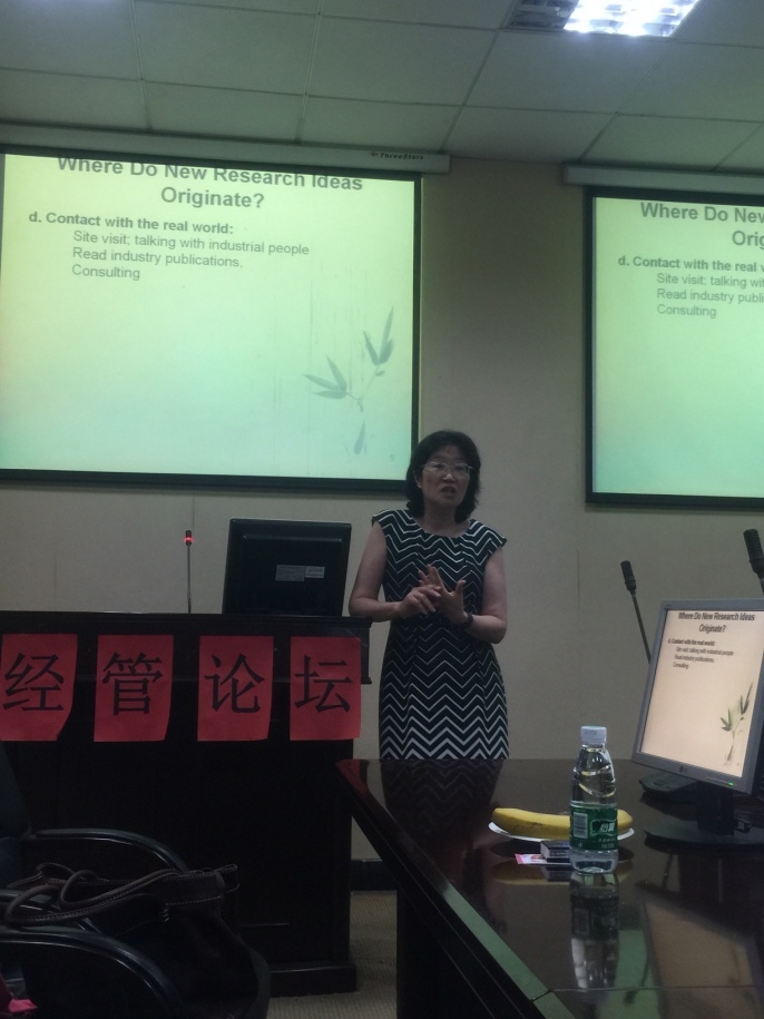 Jennifer Shang教授用诙谐幽默的语言做了简单的自我介绍,讲到她在台湾长大,在美国读大学以及留在美国匹兹堡大学做学术研究,她自谦中文英文都讲不好,却在之后用丰富精彩的语言为大家带来了一场受益匪浅的学术报告。Jennifer Shang教授主要从学术研究和论文写作两个方面对各位师生进行指导。她谈到,我们平常在做研究的时候,很多情况下尝试在别人做过的东西上做修改,这很容易抑制我们科研的创新性,也让我们研究的内容不那么吸引人,最终“事倍功半”,“吃力不讨好”。所以我们要尽可能的发挥我们的创新精神,做出一些和别人不一样的东西出来,这样才会使我们的研究更“有趣”也更有意义。针对学术交流,她指出,我们在参加学术会议的时候要学会把握机会,不要单纯的去做一个聆听者,而要能抓住交流的机会表达出自己的观点,并可以从别人身上获取自己想要的知识,这样才会让学术交流显得更有意义。她还提到,我们要善于从生活中攫取科研的养分,让我们的科研可以“落地”。我们要善于和企业交流,在和企业接触的过程中开拓视野,提高自己的科研认知,并能从中发掘科研的灵感。随后,她通过匹兹堡大学的一个教学案例现身说法,让各位与会者对她的发言有了更进一步的理解。在对学术研究作完介绍后,针对于大家最为感兴趣的论文写作,Jennifer Shang教授又对大家进行了进一步的讲解。她建议大家要带着问题去写文章,这样才能有一个清晰的主线,写出的文章才能前后连贯,一气呵成。我们很多时候太过注重模型却忽略了文章语言的丰富性及连贯性,因为对写作的不重视反而会使我们的文章显示不出应有的水平。在文章的简介部分,我们的写作应当由面及点,呈倒金字塔形,这样才更容易被理解也能更好的表达出作者观点。而在文章的主体部分,我们也要能够讲清楚我们做了什么工作。在这一部分,她还着重强调了关联性,我们在论文写作的时候一定要注重关联性,我们的研究和实物有什么关系,我们做出了怎样的贡献,这些都是我们工作的重点。最后,对于文章的模型构建以及结论部分,Jennifer Shang教授根据自己丰富的经验也表达出了自己的观点,给各位与会者带来了不一样的感受。