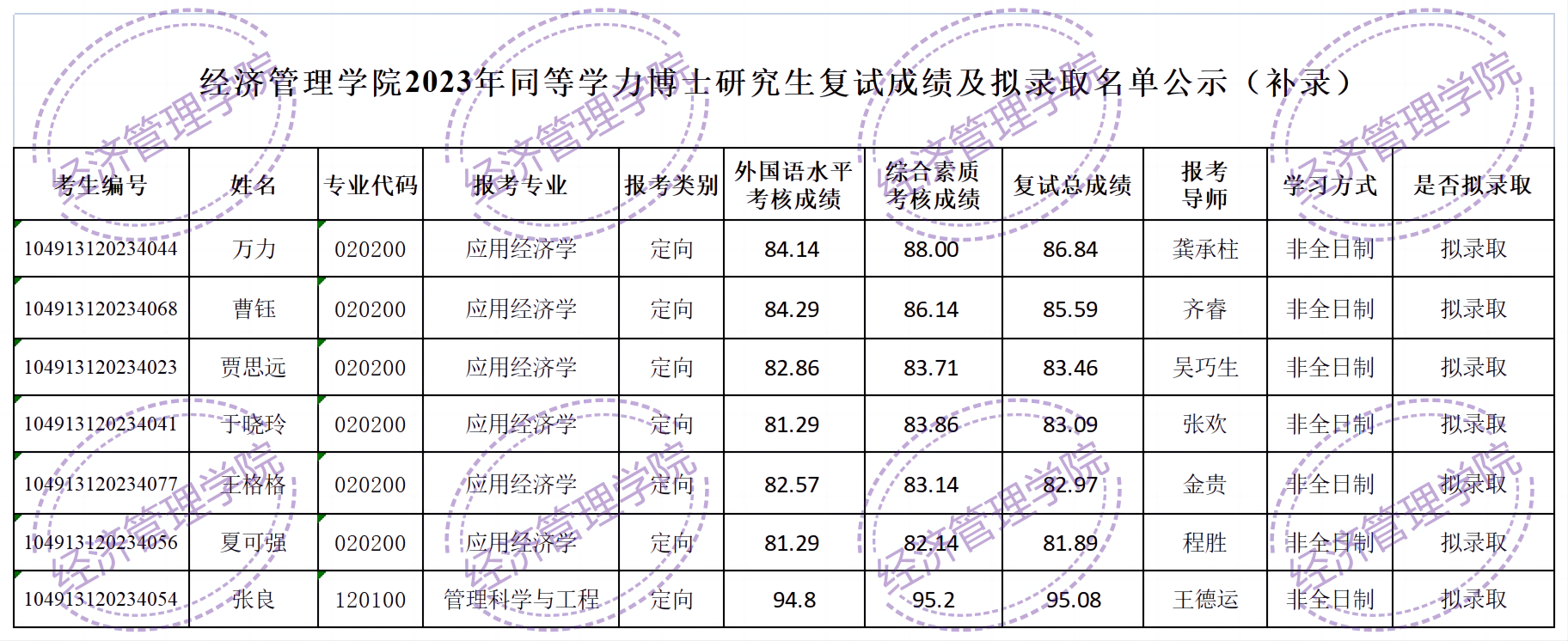 经批准,现对学院2023年拟录取单证博士生补录名单予以公示,公示期为6月16日-6月25日。在公示期内有异议的,请联系经管学院研究生办公室王老师,联系方式:027-67883204,邮箱:360655881@qq.com。
