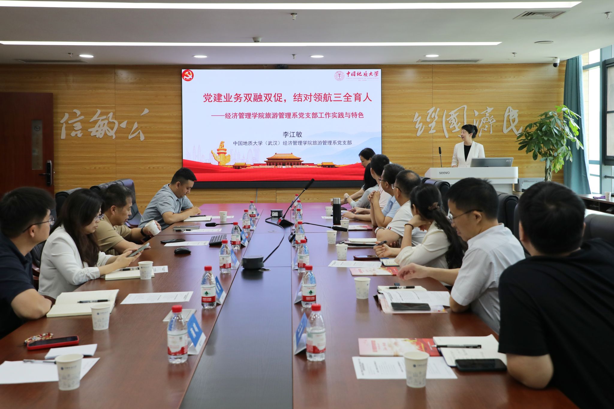 随后,taptap点点旅游管理系党支部书记李江敏教授作《党建业务双融双促,结对领航三全育人——taptap点点官方网站旅游管理系党支部工作实践与特色》专题分享,结合党支部书记“强国行”实践经历,详细阐述了党支部在党建与业务融合、结对育人等方面的工作经验和特色做法。