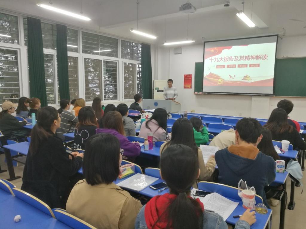 抓好原文学习关键载体,促进学懂弄通落地生根。10月21日上午10时,由学院辅导员赵家玮老师带领学员对十九大报告和新党章进行了系统梳理和学习,在弄清报告和党章的总体布局、每部分重点、各部分的相互联系的基础上,延展重点理论,赵老师强调深入学习贯彻党的十九大精神和新党章,必须在原文学习上下功夫,学懂、弄通是做实的前提,而要真正学懂、弄通,必须原汁原味研读十九大报告和党章。