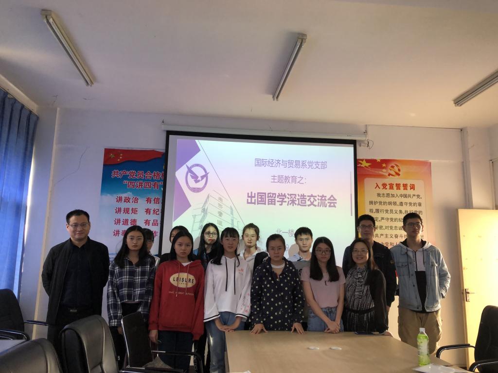 (通讯员:易杏花 苗瑞瑞)2019年10月24日14:00—16:30,taptap点点官方网站国际经济与贸易系党支部在北一楼421室召开了出国留学深造交流会,这既是党支部“结对领航”的一项重要工作内容,也是“不忘初心 牢记使命”主题教育的一个重要环节。活动由国际经济与贸易系党支部书记易杏花主持,系主任白永亮、系副主任洪水峰,国贸系2016级本科生田翔、安浩楠、邓学霖,以及17级——19级有志于出国留学深造的学生参加了本次活动。