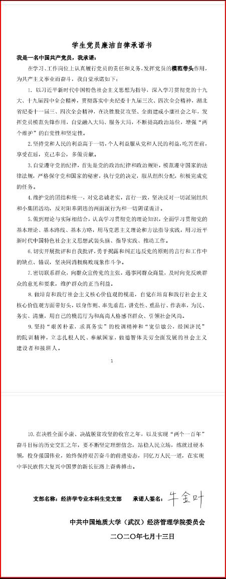 推进支部建设,切实肩负党风廉政建设责任。学院党委积极贯彻落实学校《党风廉政建设责任制实施办法》,组织全体学生党员签订《学生党员廉洁自律承诺书》,要求学生党员在学习、工作岗位上认真履行党员的责任和义务,自觉遵守党的纪律,在决胜脱贫攻坚、全面建成小康社会之年,不断提高政治站位,增强“两个维护”的自觉性和坚定性,主动将支部党风廉政建设融入上级党组织“一级抓一级,层层抓落实”的党风廉政教育体系当中。