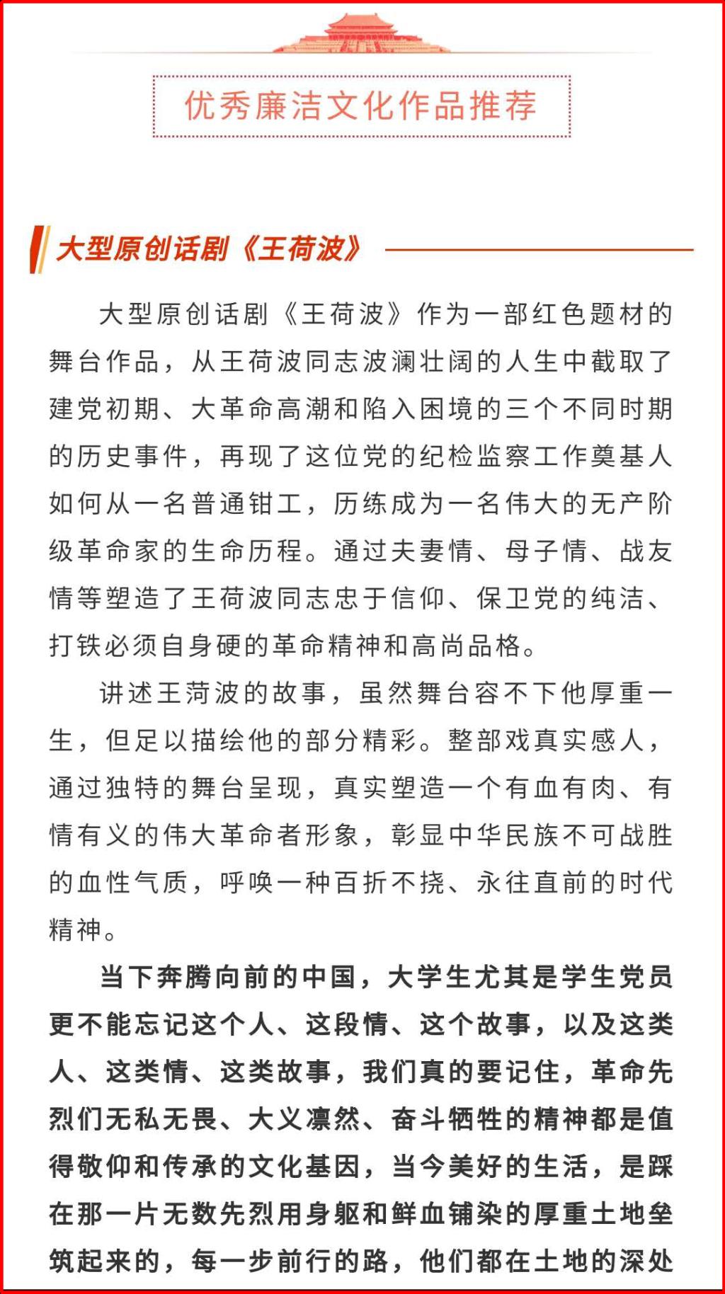 开展“以案五说”警示教育,多角度诠释党风廉政。学院依托官方微信平台,推出“党风廉政宣传教育”系列推文,深入解读《中国共产党纪律处分条例》,展示《巡视利剑》、《永远在路上》、《王荷波》、《铁血忠魂》等一批优秀廉政文化作品,以多元化的方式弘扬优秀党员的廉洁作风,以真实的案例警示学生党员正纪肃风,警示全体师生党员严格遵守党纪党规,守住纪法底线,将“廉洁”牢记于心。