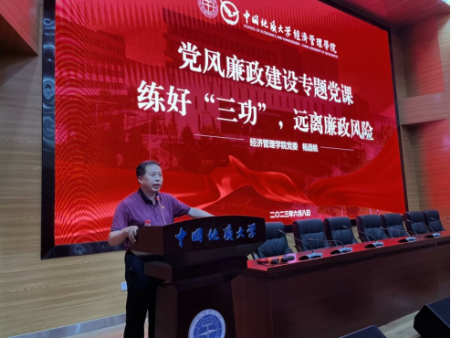 杨昌锐以“练好‘三功’,远离廉政风险”为即将走出校园的毕业生党员讲授党风廉政专题党课。杨昌锐指出全体毕业生党员要 “练好思想上的‘内功’”,提高思想境界、克制欲望、防微杜渐对牢固思想防线的作用和意义;要锤炼“守住廉洁自律的‘防功’”,他表示所有的权力都是组织赋予的,每位毕业生党员都要以人民利益至高无上为基本准则,在岗位上全心全意为人民服务,自觉做广大人民群众利益的忠实代表;要具备“划清公与私的‘硬功’”,正确对待亲情、友情、恩情,算好“政治账”“经济账”“名誉账”“家庭账”“亲情账”“健康账”等六笔账,真正做到明大德、守公德、严私德。