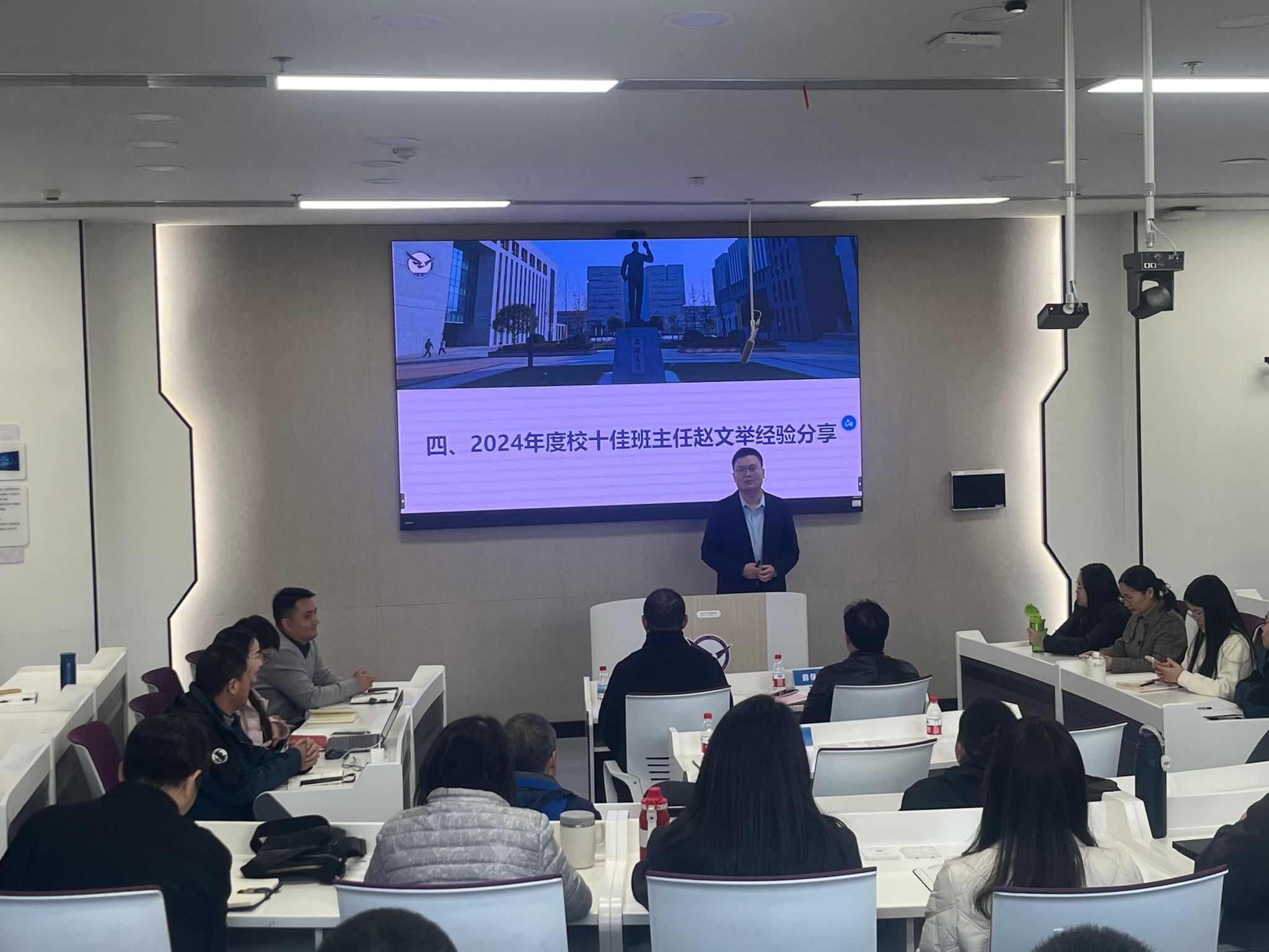 会上,学院辅导员分别就本科生各班级学风、就业情况,班主任年度考核和评优工作等进行了汇报介绍。分团委书记、2023级辅导员徐媛结合近期课堂考勤监督强化、请假流程进一步规范、晚自习日常管理和学业帮扶计划等方面介绍了学院“红鹰促学”计划开展情况和阶段性成果。她从学生课程成绩的具体数据客观分析了当前学风建设中的亮点与存在的不足,提醒班主任们关注班级学风动态。2022级辅导员蔡杨就毕业生班级就业工作展开汇报。他结合具体数据分析了近年来毕业生就业去向,学生考公、考研意向的变化新形势,针对2025届毕业生和2026届毕业年级的学生就业意向,就业行业分布特点,以及学院就业帮扶成效和面临的工作挑战作了详细介绍,并围绕下一步就业指导工作为班主任开展就业帮扶提供了一定的方向参考。学工办主任努尔夏提・居勒提介绍了年度班主任工作考核及评优工作,并就相关要求进行解读。他从考核原则、评优指标、标准流程、激励机制等方面逐一说明,动员班主任们积极参加考核和评优,以评促优充分展现班级风貌和培养学生的成效。