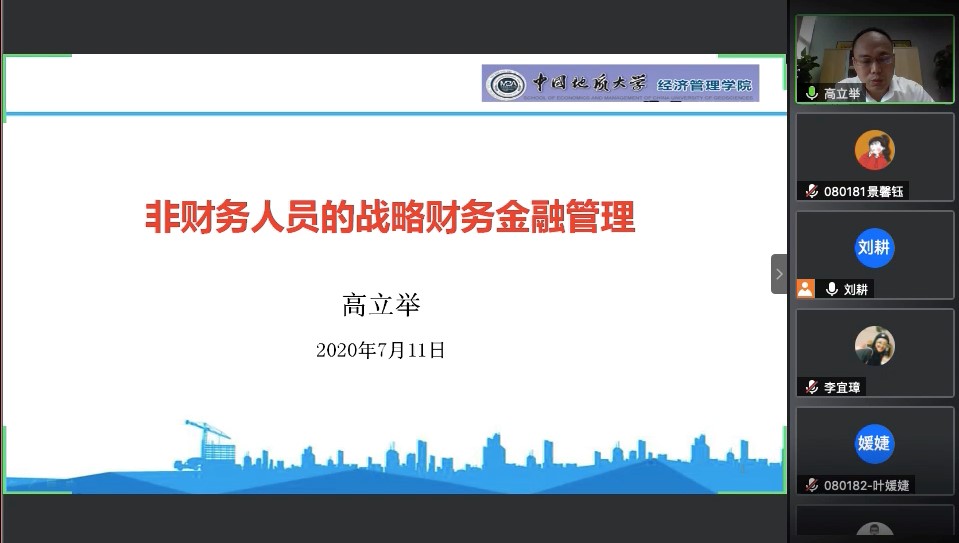 本次讲座在工商管理系刘耕老师的主持下,于2020年7月11日上午8:30在腾讯会议准时召开,学院副院长郭锐教授、工商管理和市场营销专业130余位师生参加,讲座的主题为《非财务人员的战略财务金融管理》。