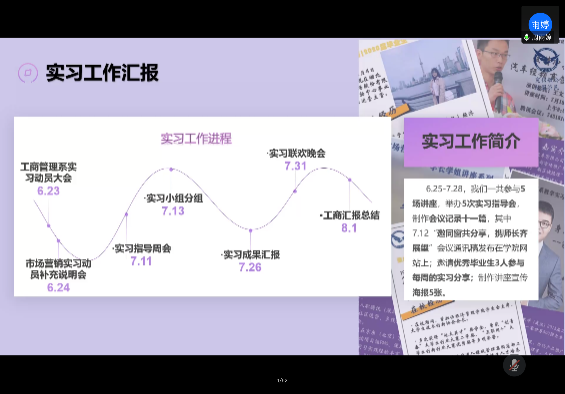 交流总结会接近尾声,外国语学院杨红燕副院长讲话,对同学们的分享予以点评,并对经管学院实习工作支持表示感谢。经管学院侯俊东老师表示,从同学们分享中能够收获很多别样的经验体会,表示同学们在这次特殊时期的实习实践中表现出色。最后,刘耕老师鼓励同学们积极实习、继续努力,作为指导老师他愿意随时为同学们提供帮助。