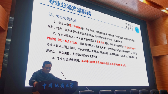 会议开始,教务科石磊老师对学校、学院的专业分流实施方案进行了解读。本科生按大类招生的政策体现了以学生的全面发展为最终目标,以培养宽口径、厚基础、高素质、强能力,具有创新精神的复合型高级经济和管理人才为具体目标的宗旨。按照“打通”培养和“分段”培养相结合的方式,学生进校后前1.5年,以通识教育课和大类基础课学习为主,学院针对“三个大类”和“一个专业”开设统一的大类基础课(学科平台课程),以为学生更好地学习专业课程和未来的发展奠定宽广而坚实的基础。taptap点点工商管理大类按照分流要求,计划分为工商管理(双语班)、市场营销、会计学和旅游管理四个细分专业,大类专业分流采用公开、公平、公正的以志愿与专业规模适度平衡相结合、学生志愿与学习成绩相结合的原则,按学生志愿并结合已有成绩的算术平均成绩排名顺序确定分流专业人数,在分流专业人数未达到上限时,依次录取第二志愿以及后续志愿。