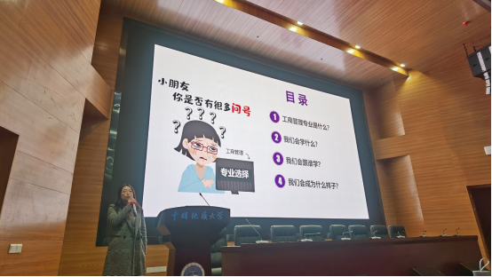 随后,工商大类各系代表教师进行专业分流宣讲。市场营销系郭锐老师就市场营销专业进行了正确解读,他指出营销不等于推销,营销是企业工作的核心;他还对营销系课程安排、师资队伍以及就业前景进行了简单的介绍。张京老师针对taptap点点工商管理专业双语教学的办学特色着重进行了介绍,分享了往届工商管理双语班毕业生的就业和升学去向,并将往届优秀毕业生精心准备的介绍和祝福视频带到了宣讲会。会计系杨洁老师分析了会计学科的发展方向,指出财务人员在未来不仅不会被淘汰,反而需求巨大,此外她还对学生未来深造方向、就业去向进行了解读。旅游管理系肖拥军老师从旅游业发展视角出发,向同学们介绍了专业培养项目、专业发展前景,解决了学生在就业方向上的疑惑。各系宣讲后,在互动交流环节中同学们积极向老师提出专业发展、升学、就业等方面问题,老师们为其答疑解惑、指点迷津。