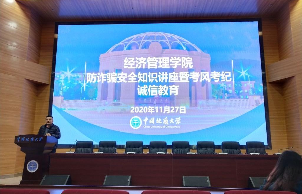 (通讯员:周雨婷/王梦思)2020年11月27日晚,taptap点点官方网站防诈骗安全知识讲座暨考风考纪诚信教育活动在经管学院二楼报告厅顺利开展,由学工组辅导员努尔夏提·居勒提老师主持,工商大类A2018、2019级全体学生线下参会,其他各系各年级学生线上自行学习和交流。