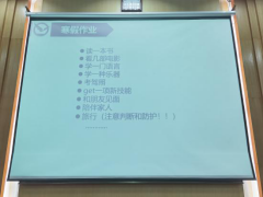 会议第四部分,徐天宜老师通知关于寒假的安排,并提醒同学们合理安排假期时间。徐老师着重强调了假期安全问题。她提醒同学们:一方面,树立常态化疫情防护意识,回家路上和假期外出做好个人防护,并按照要求向学校上报健康日报;另一方面,注意自身的人身和财产安全。徐老师还很贴心地为同学们准备了“寒假作业”——“读一本书”、“看几部电影”、“学一门语言”等等。她紧接着介绍了几部对同学们的心灵成长具有重要启发意义的书籍与电影。会堂的气氛活跃起来,看着屏幕上“和朋友见面”、“陪伴家人”等字样,同学们的内心暖暖的。