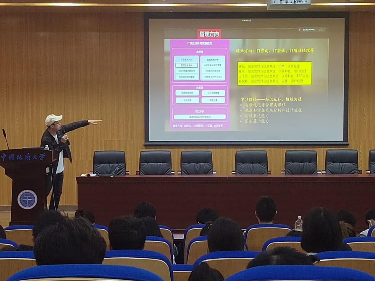 首先江毅老师给出了信息管理与信息系统的定义:面向数字交互场景,利用信息技术搭建最高效的管理工具和实施方案,支持组织管理决策和数字化创新。他强调同学们在学习中要注重培养编程开发、数据分析、IT项目分析和实施、系统决策与建模以及数字产品设计和运营五个能力,并将本专业分为技术与管理两个侧重发展方向进行介绍。随后,江毅老师进行了拓展讲解,分别阐明了四个未来就业方向,一是研发岗、软件开发工程师;二是数据分析师、数据运营;三是IT咨询、IT实施、IT项目经理;四是互联网企业产品经理、数据运营。他指出每一个方向又都含有与其他方向不同的学习路径,例如研发岗会更侧重实践的积累,最好能有相关竞赛证书和研发经历;数据分析强调学研结合,鼓励积极参与各类科研项目与竞赛;IT有关职业则更看重知识互补,同时也要加强沟通交际能力;产品经理方向就更偏向实习经历与掌握互联网思维和逻辑。
