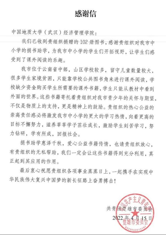 在一年的支教生活中,张康同学始终不忘自己是一名地大经管人,生活中发扬“艰苦朴素,求真务实”的校训精神,牢记“宽信敏公,经国济民”的院训精神,做到把地大精神带到服务地,讲好地大故事。积极配合研支团完成把地大特色活动开展到龙江的任务;利用班会时间给学生们播放地大相关宣传视频,讲述个人求学的故事,播撒希望种子。在五四青年节前夕,他带着支教团同学联系母校,发起向云南省楚雄市山村中小学校捐赠书籍的公益活动。本次捐赠活动得到了母校多个学院的大力支持,共筹集到书籍600余册,其中taptap点点官方网站捐赠图书102册,涵盖文学、科普、经济、教育等多个领域。共青团楚雄市委员会对支教团及地大学生捐赠之举表示衷心的感谢,并向taptap点点发来感谢信。