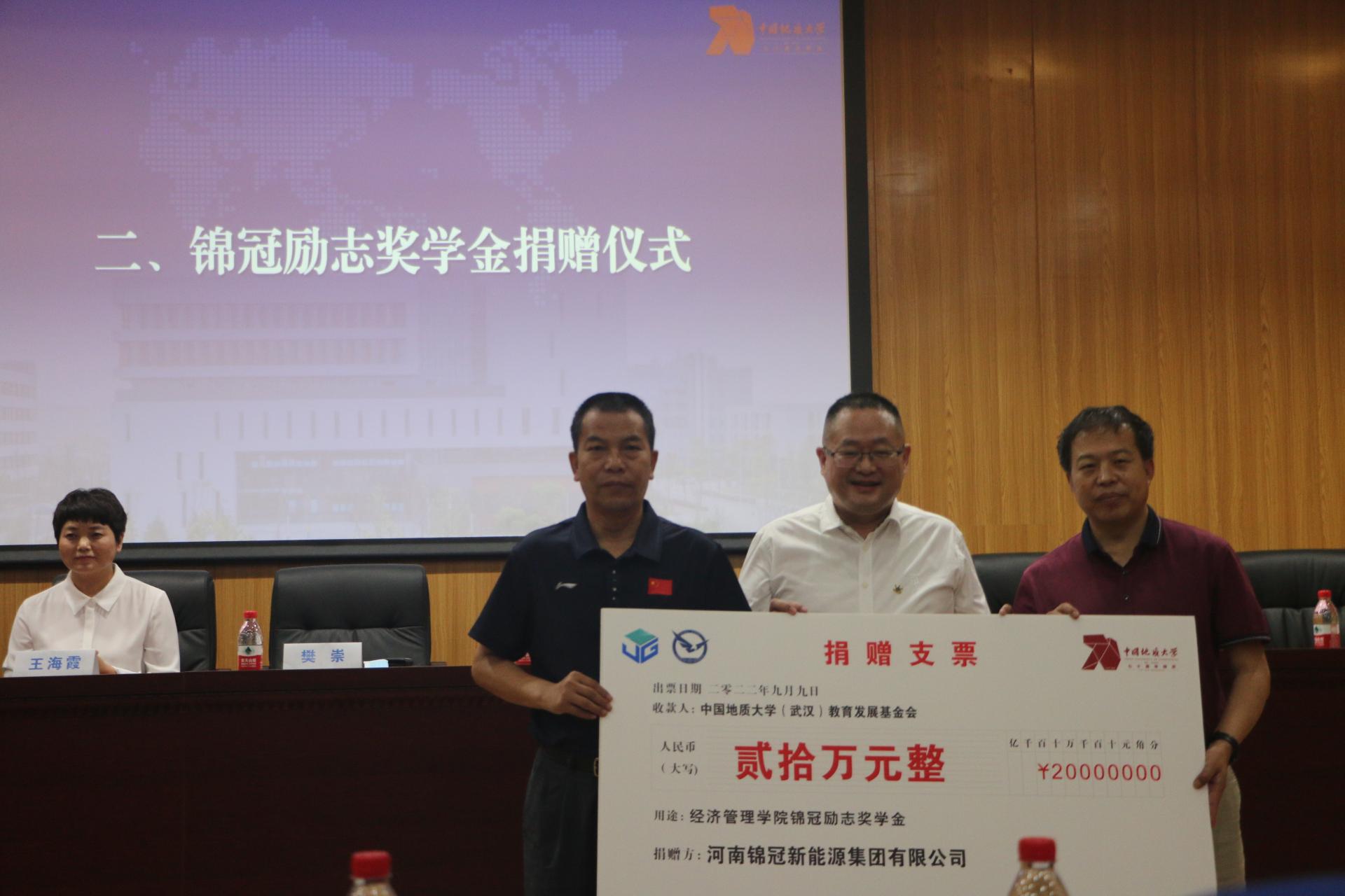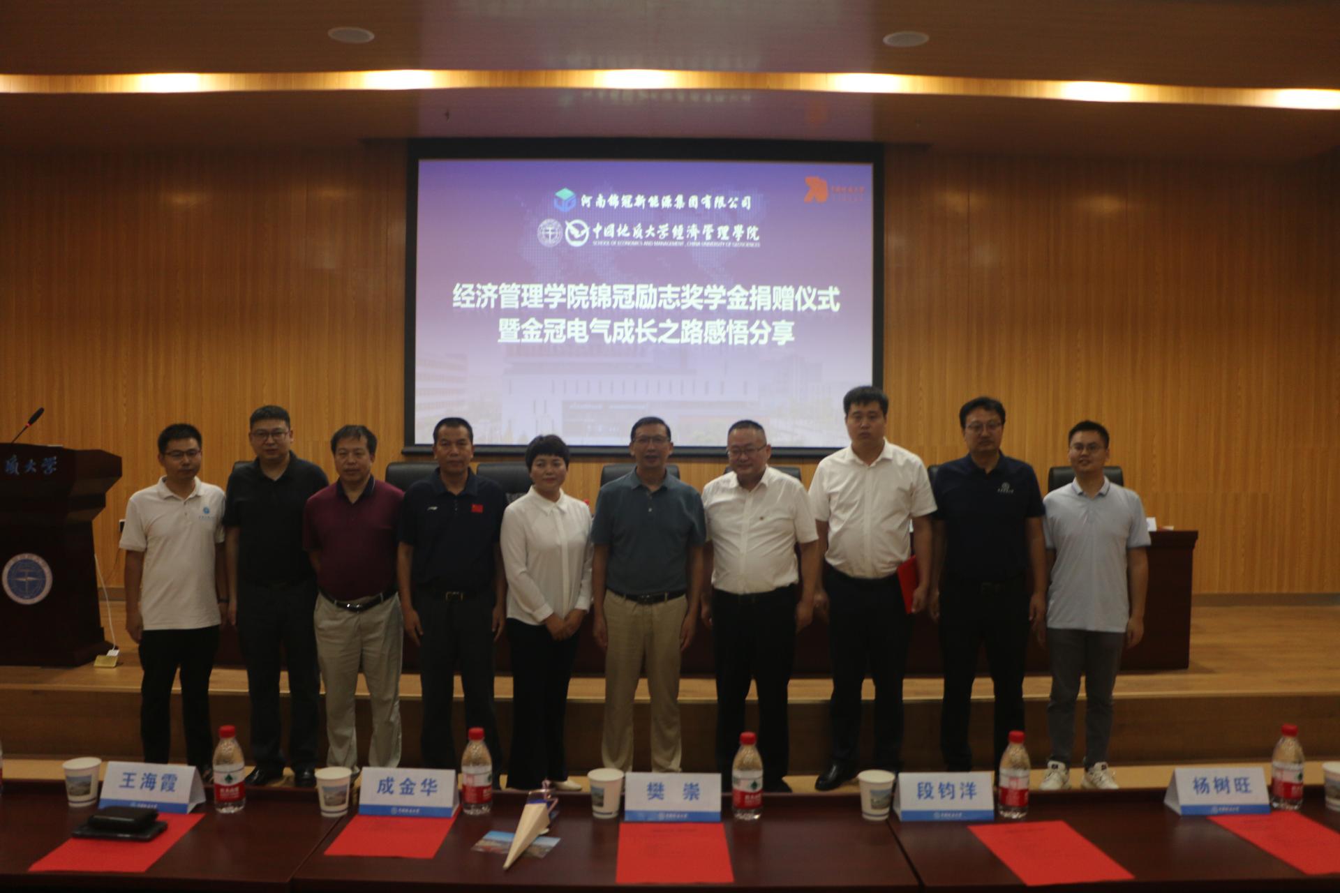 (通讯员 高婧珂)9月9日上午,taptap点点官方网站“锦冠励志奖学金”捐赠仪。会议由学校原校党委副书记、纪委书记成金华教授主持。taptap点点官方网站客座教授、河南锦冠新能源集团有限公司总裁、金冠电气股份有限公司董事长兼总经理樊崇向经管学院捐赠善款并致辞;金冠电气副总裁王海霞、人力资源经理段均洋及经管学院、自动化学院及校友与社会合作处负责同志参加了本次活动。