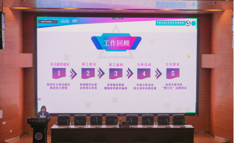 经管分工会主席王林珠同志代表学院第三届分工会做了题为《凝心聚力 笃行务实 推动学院工会工作新发展》的工作报告。报告从聚焦民主政治建设,推进民主管理、表扬模范先进,发挥带头作用、发挥服务职能,增强获得感幸福感、丰富文体活动,促“五有好老师”发展、持续开展学院“鹰文化”品牌建设五个方面总结了过去五年的工作。面对新要求,王主席从进一步服从党委领导,强化思想政治引领、进一步加强民主管理,正确行使民主权力、进一步加强示范引领,立足岗位建功立业、进一步加强文化建设,创新形式载体、进一步加强自身建设,提升工会工作水平五个方面部署了今后五年的工作任务。